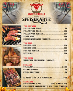 Wir bieten Pulled Pork, Beef Brisket und Spare Ribs nach eigener Rezeptur an.